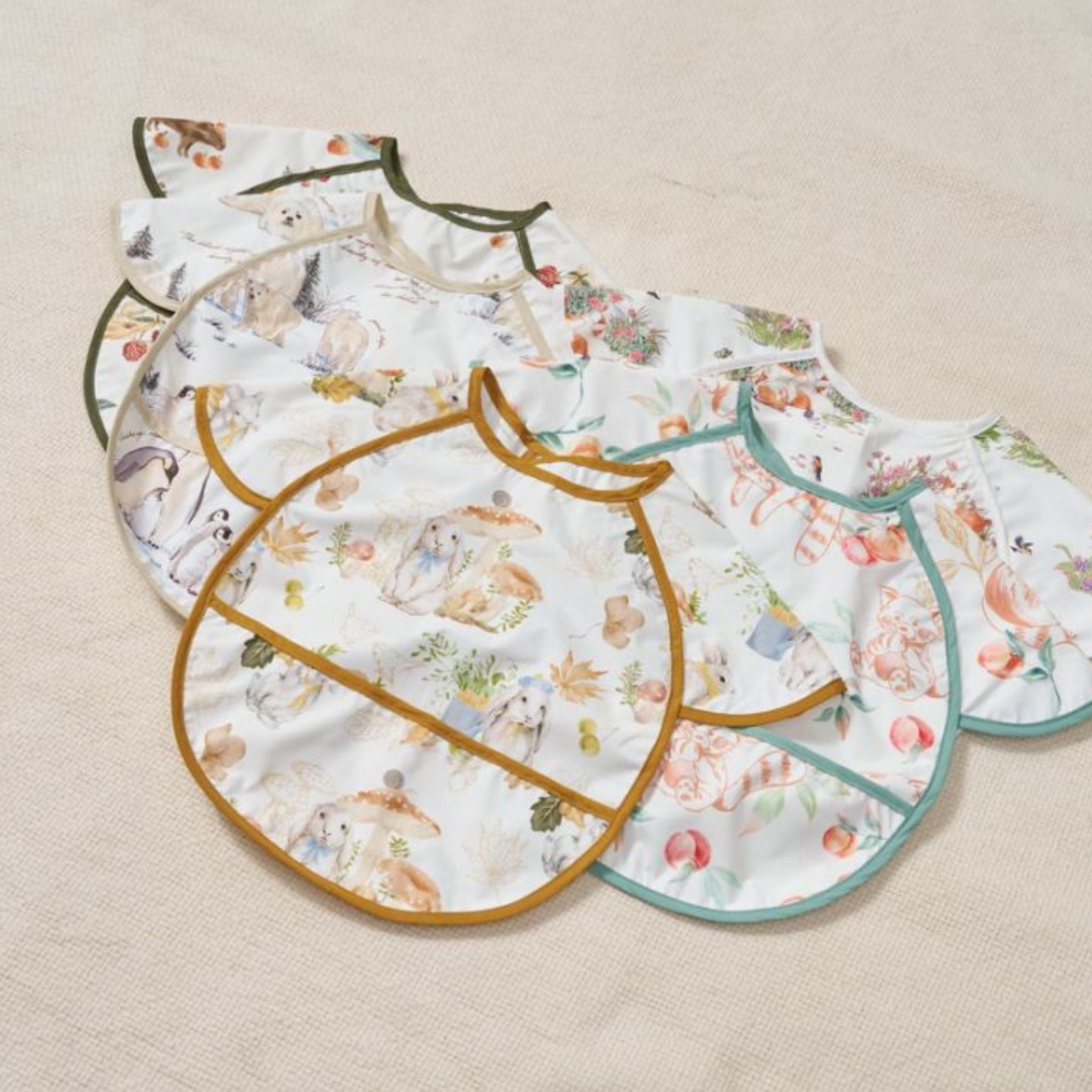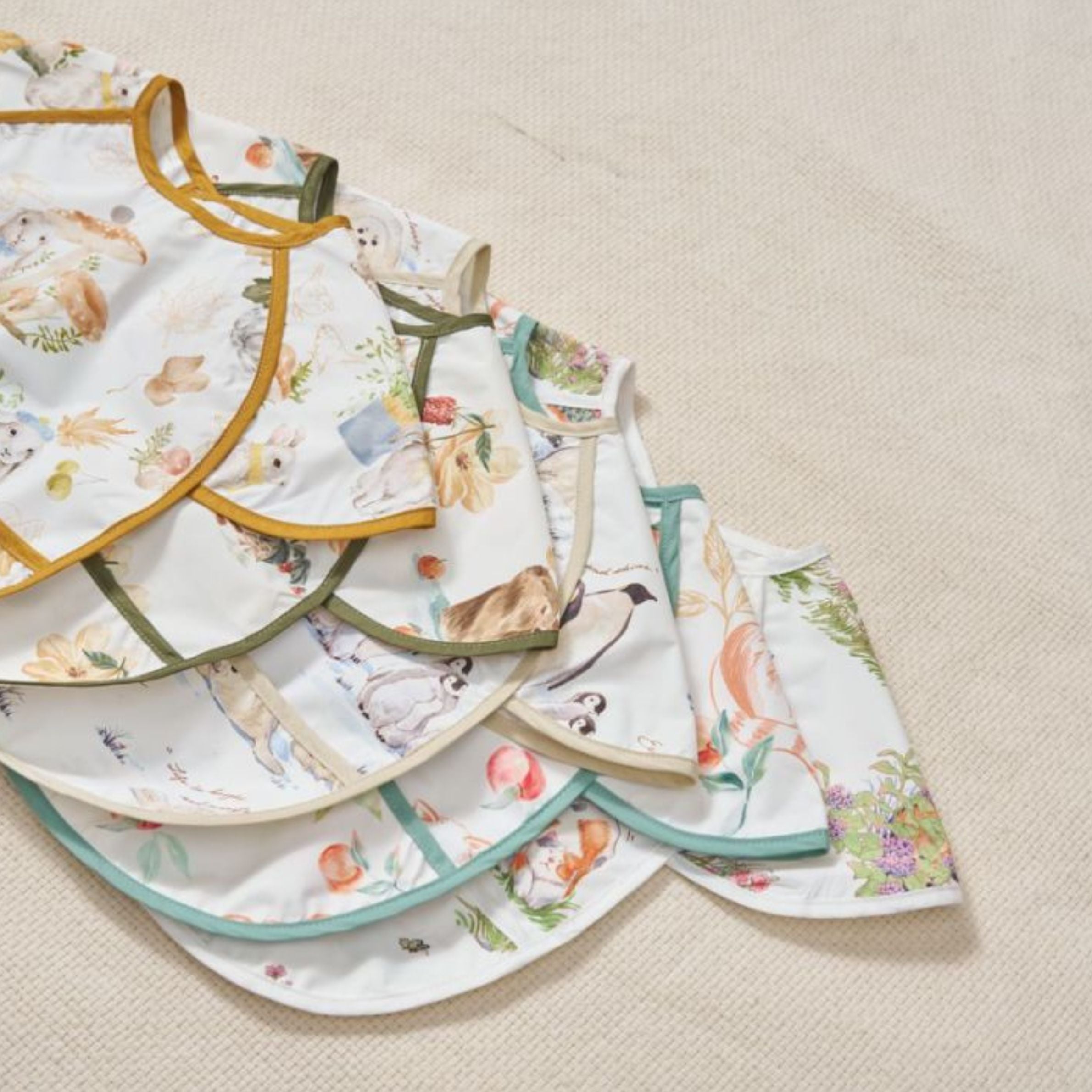 Cozy, comfortable & trustworthy. Inspired by nature and art, each piece is made with love, safety, and attention to detail. Waterproof and easy-clean for messy mealtimes and practically weightless and foldable for family travels! Other winning features include a secure back velcro strap, shoulder-sleeve coverage, and a catch-all pocket for food spills. Its unique print designs are patented and made from eco-friendly dyes.