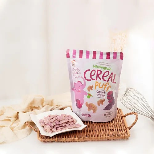 Apple Monkey Wholegrain Cereal Puff are rich in fiber , minerals, and vitamins, and shaped into an elephant shape that is appealing to a little one . These meltable puffs are perfect for encouraging self – feeding skills and make a great snack or addition to meals that can be enjoyed on the go.