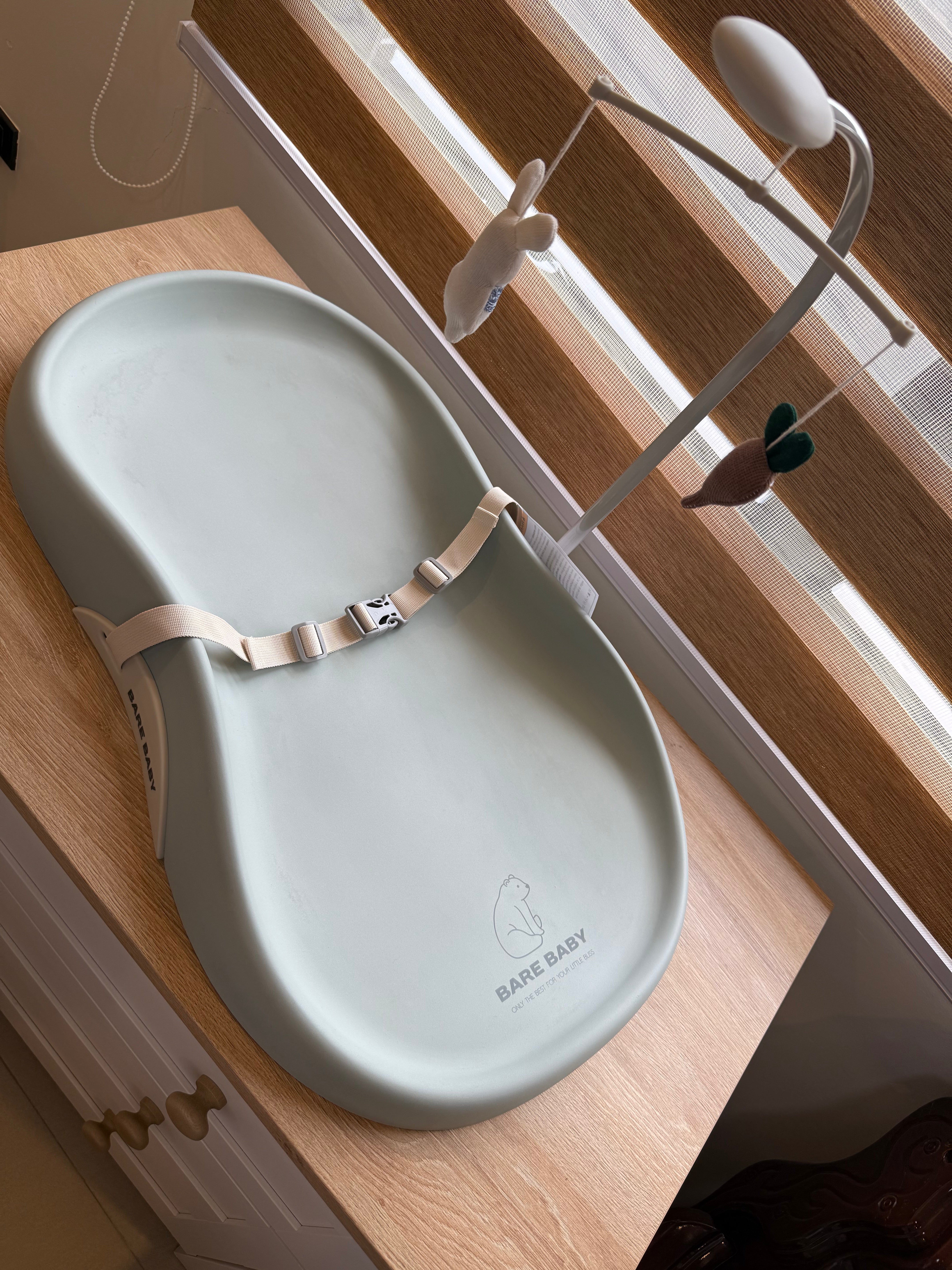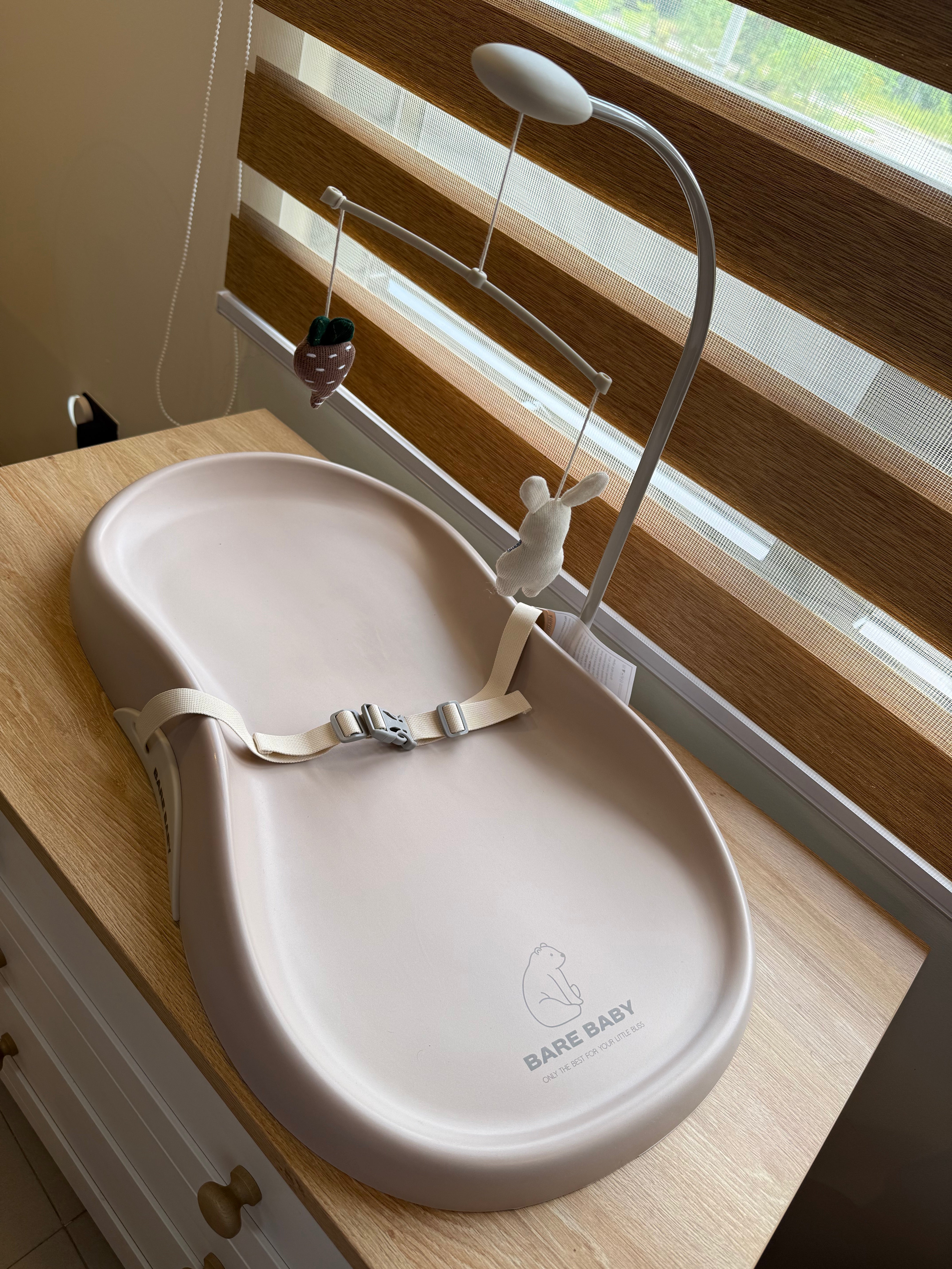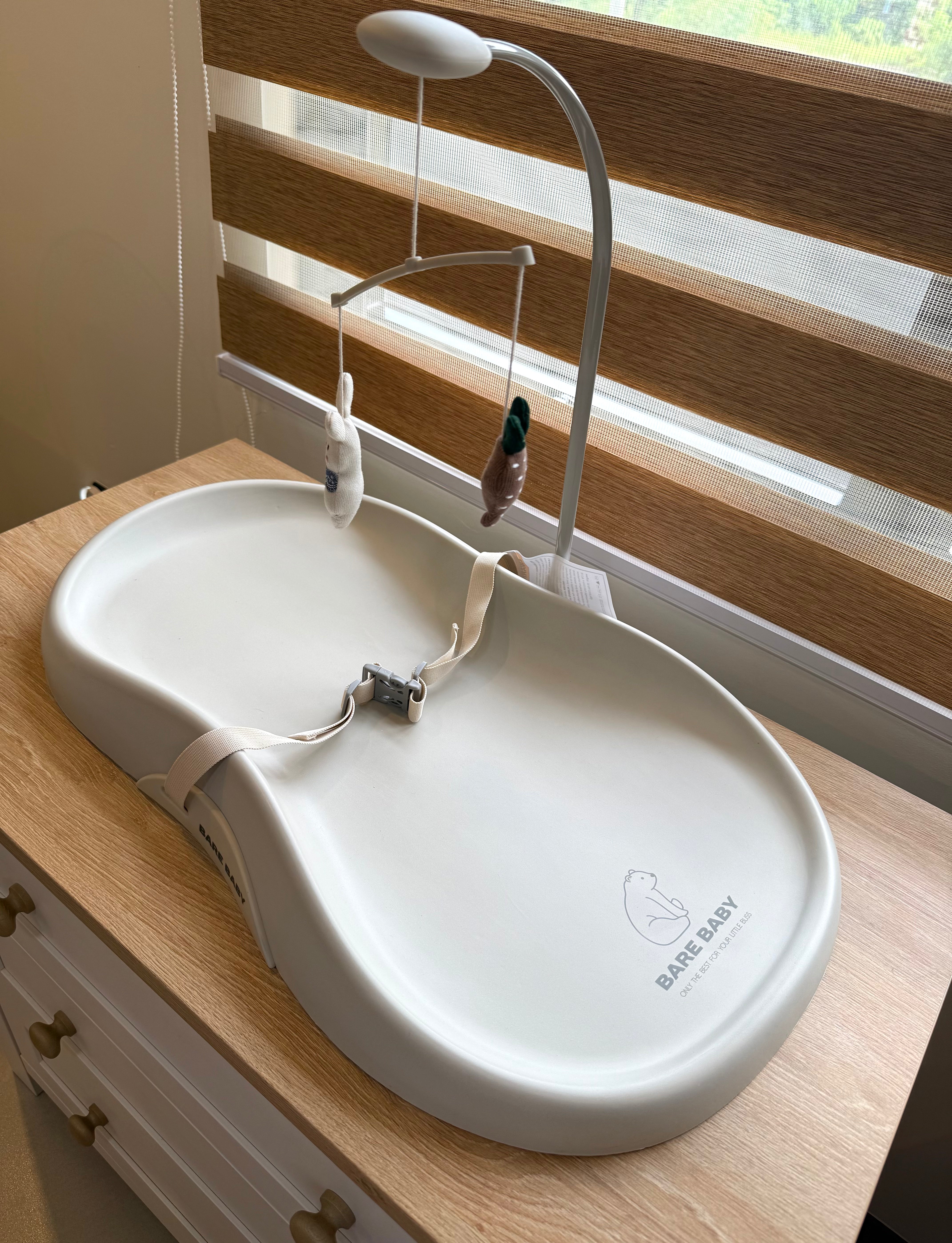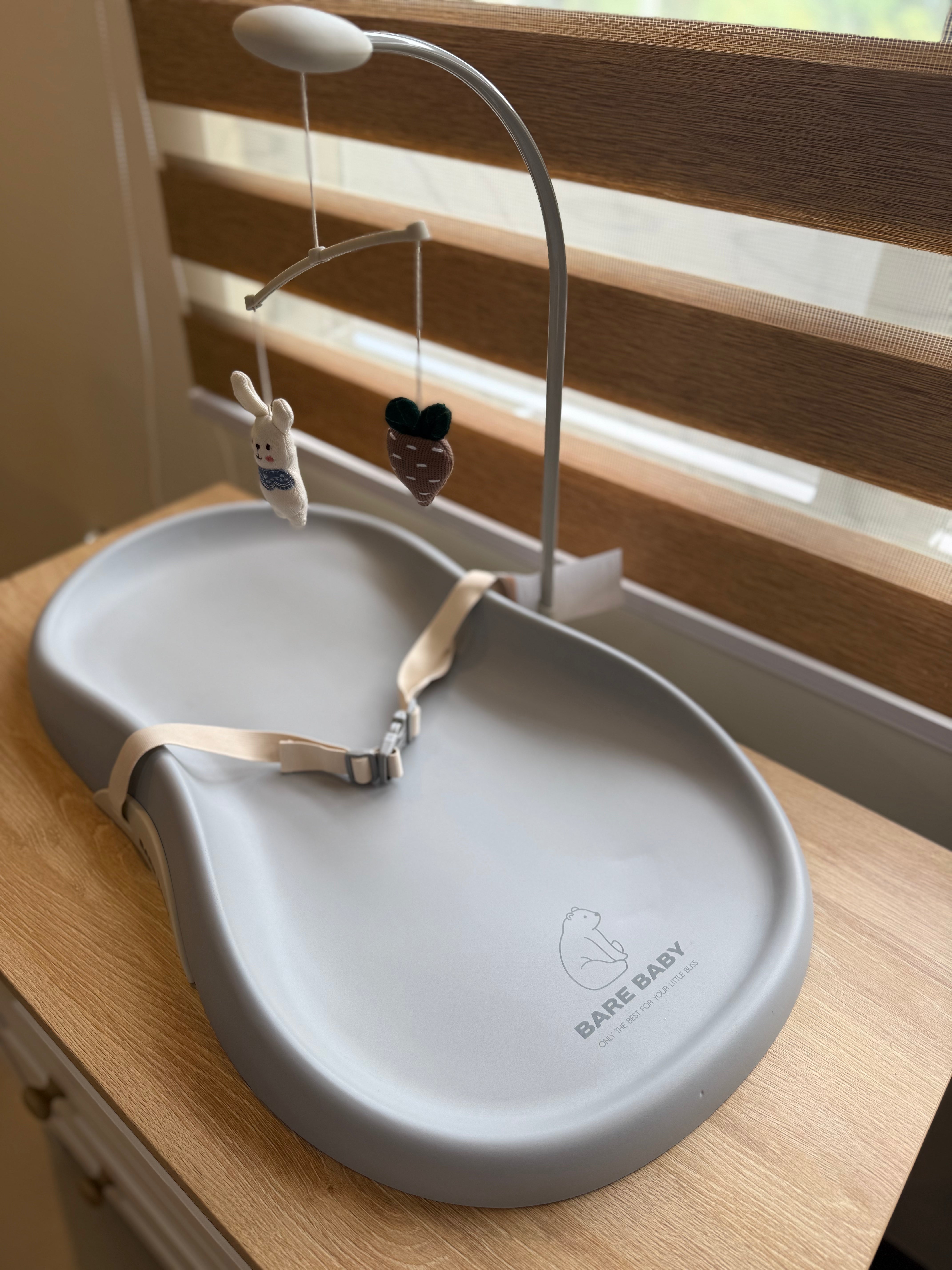 Bare Baby Premium Changing Pad with detachable toy, safety seatbelt, waterproof, easy to clean