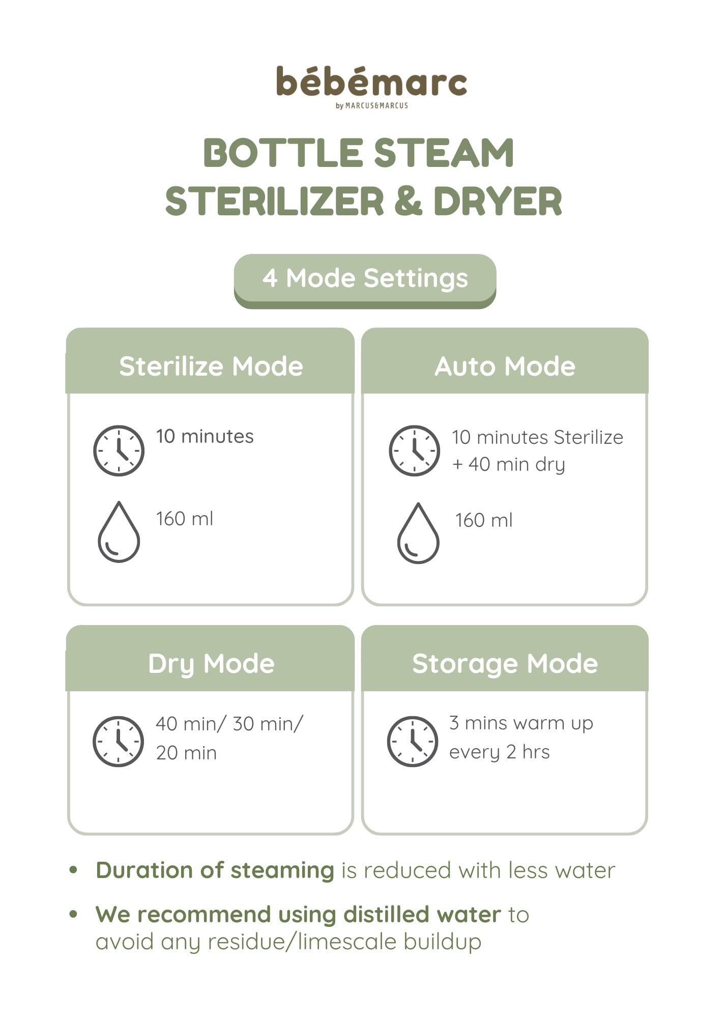The bébémarc Bottle Steam Sterilizer and Dryer efficiently sterilizes and dries up to 10 baby bottles in just 50 minutes, utilizing steam to eliminate 99.99% of bacteria and viruses.