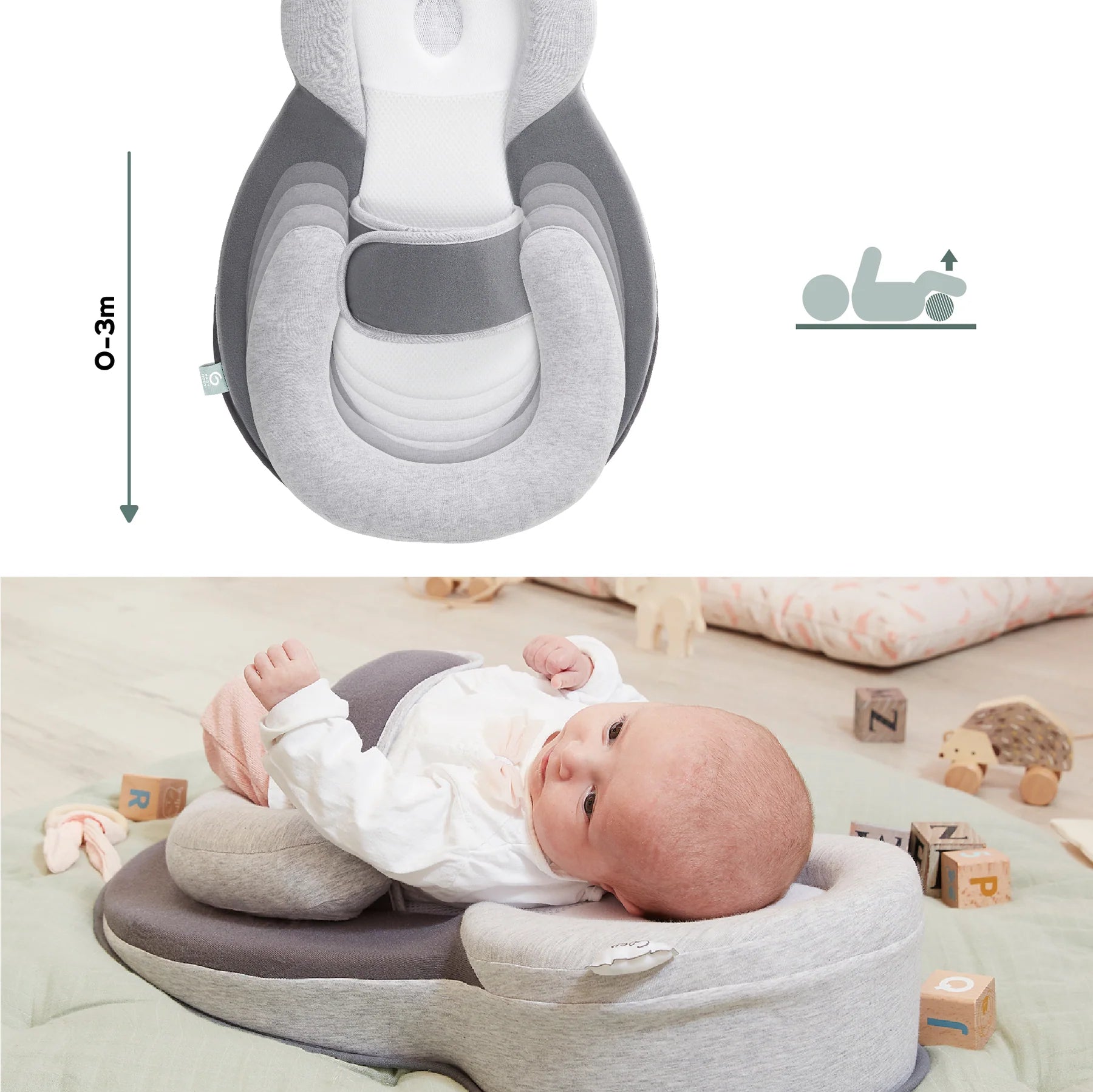 With its anatomical shape and support belt, the Cosydream(+) keeps your baby comfortably on its back (in accordance with WHO recommendations). Tilted at an angle of 10°, it keeps your baby’s airways clear and reduces regurgitation. To aid digestion, the adjustable microbead-filled positioning roll raises your little one’s legs. This “tuck position” keeps babies in place and reminds them of their nine months in their mum’s womb. The Cosydream(+) includes an anatomical head support. This reduces the risk of flat head syndrome.