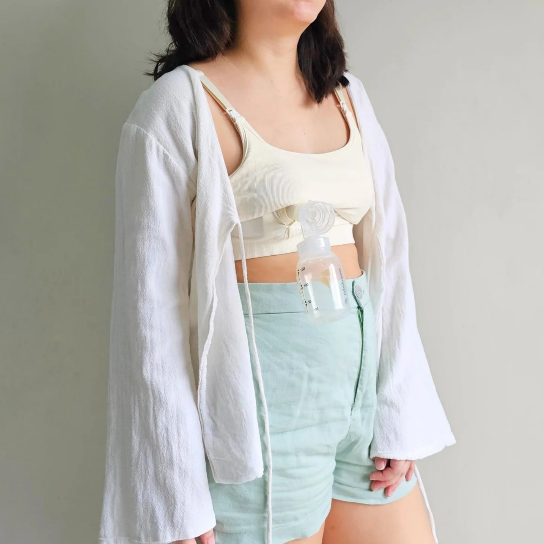 Our padded scoop neck bra has clasps that you can easily unhook with one hand to nurse. To pump with traditional/trumpet style flanges, simply lift the outer layer and insert them through the holes. Then pull down the outer layer to secure. Our bra can fit standard flange sizes and should be able to hold the bottles securely even when full of milk so you can multi-task (or relax) while pumping.