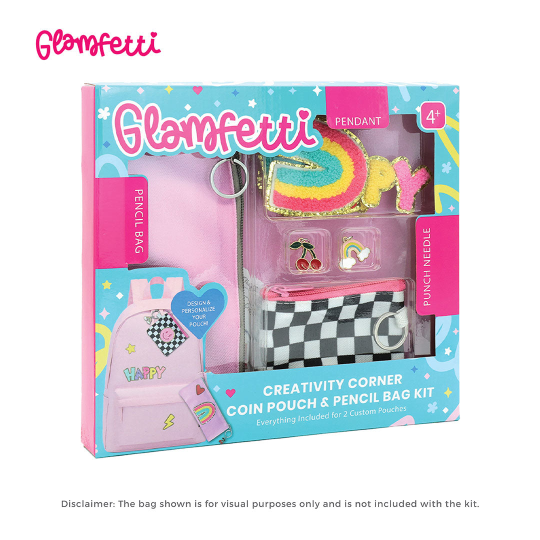 Unleash your creativity with the Glamfetti Creativity Corner Coin Pouch & Pencil Bag Kit. This all-in-one kit allows kids to design and personalize two unique pouches—one for coins and one for pencils. With a fun assortment of patches, pendants, and easy-to-follow instructions, this kit is perfect for expressing individuality and style.