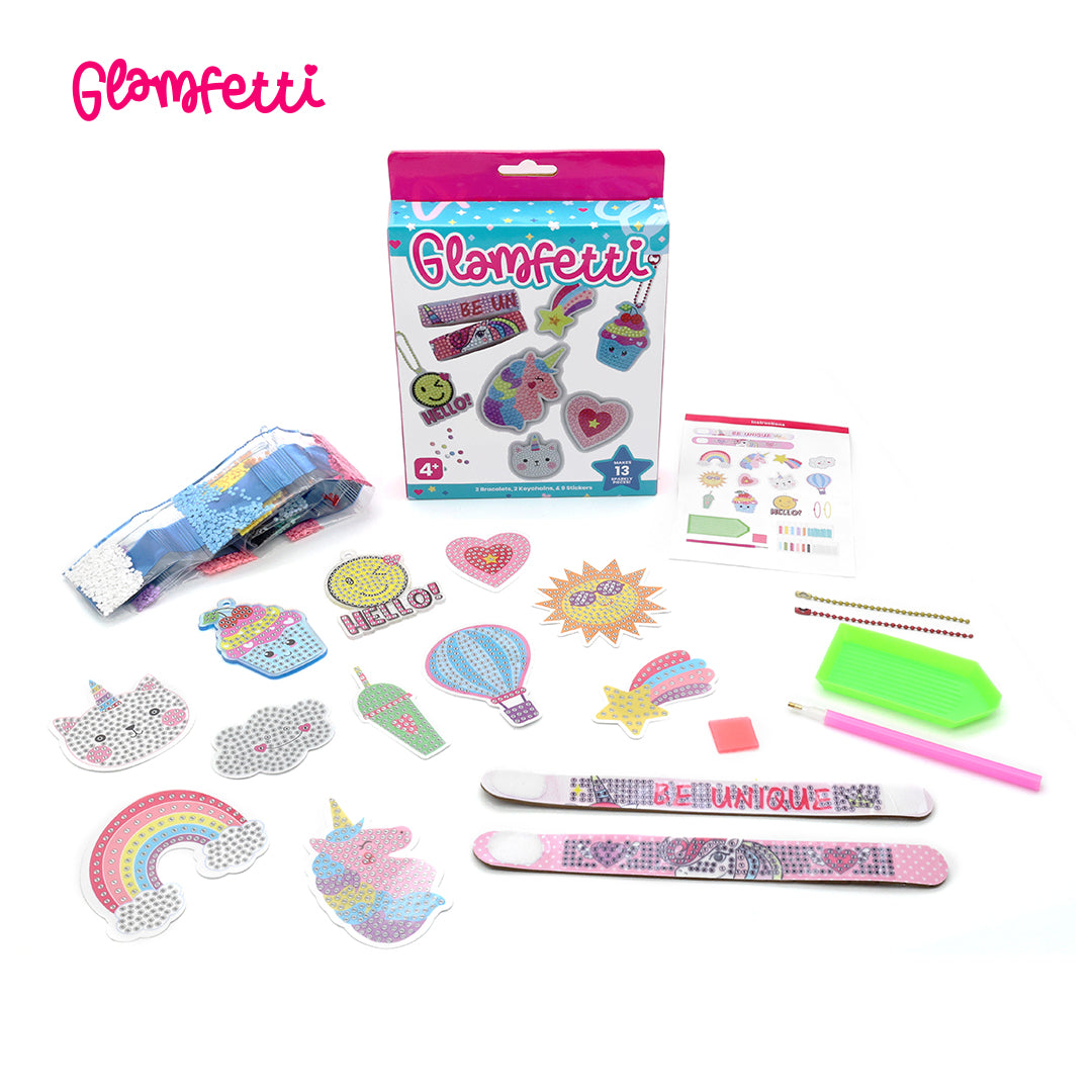 Dive into Glamfetti’s world of glittering artistry with our Sparkle and Fun Diamond Art Kit! Perfect for creative minds, this kit lets young designers bring 13 sparkling creations to life. With everything included, you can craft two chic bracelets, two adorable keychains, and embellish your favorite items with nine vibrant stickers—all shimmering with beautiful diamond beads.