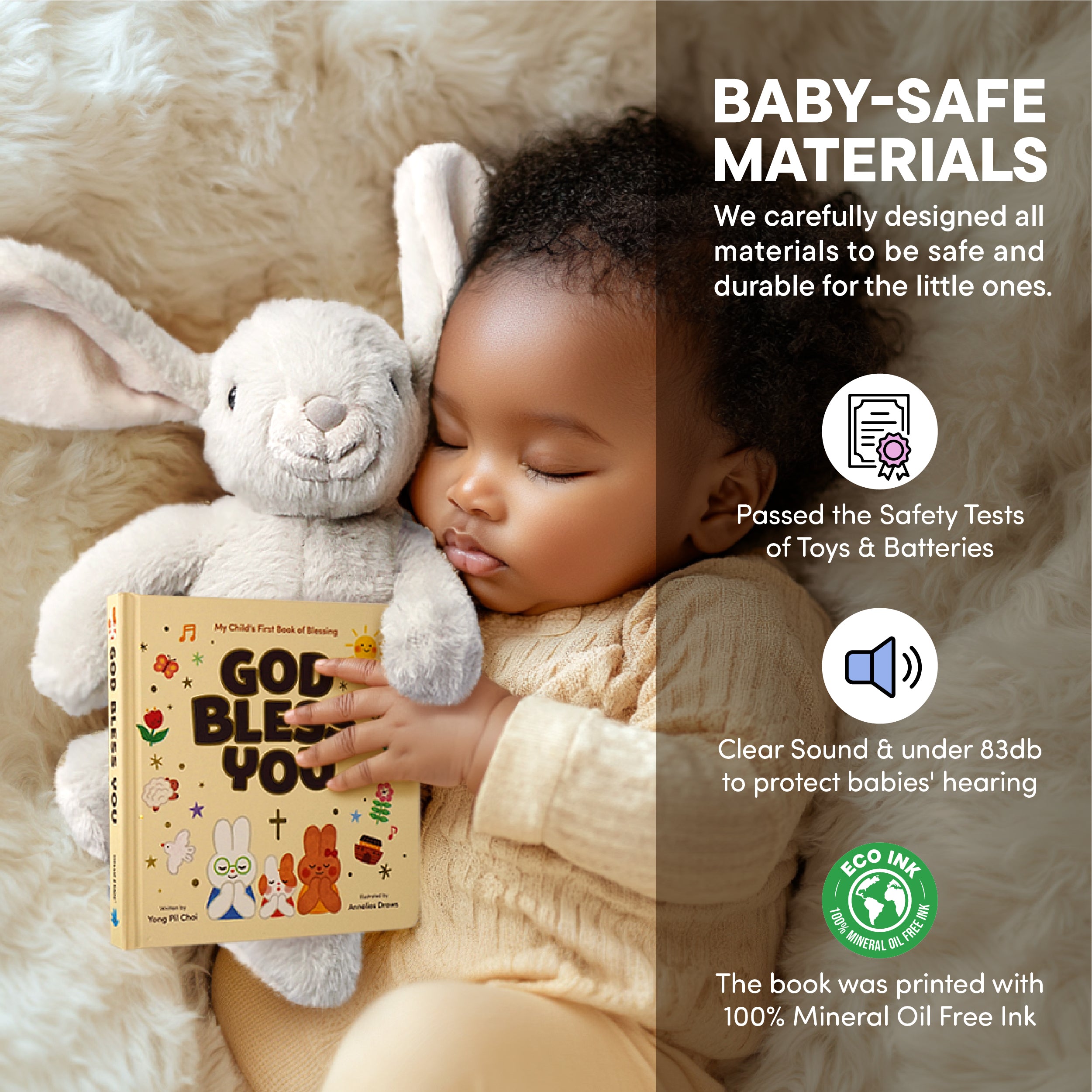 A new plush toy that sings Bible songs. Enjoy memorable bonding times with the "God Bless You" book printed with ECO-INK and baby-safe materials.