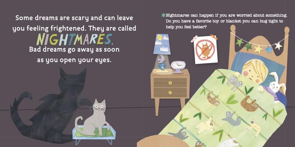 Told in easy-to-understand terms, this sturdy board book is full of bright illustrations of kids brushing their teeth, reading a bedtime story, turning out the light, and waking up rested. Kids will also learn why our bodies need to rejuvenate, what dreams and nightmares are, and how pets and wild animals sleep. Useful prompts on each page help adults engage with the reader.