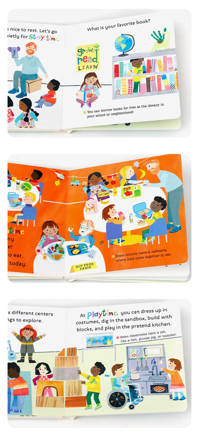 Told in easy-to-understand terms alongside bright, cheerful illustrations of teachers, students, learning centers, lunchtime, recess, and home time, this sturdy board book will help calm back-to-school jitters by walking children through a full day.