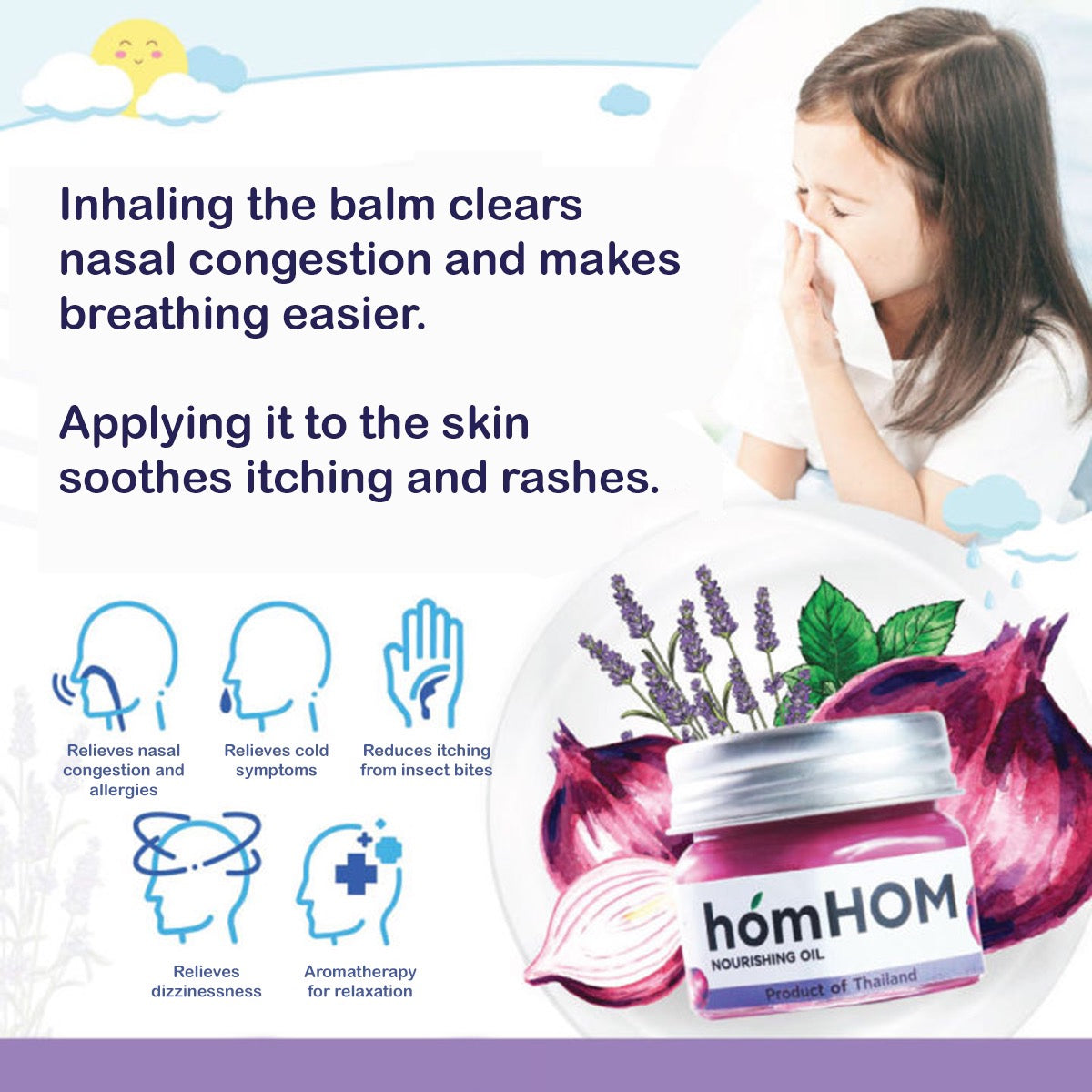 homHOM Herb Balm is good for people with allergies, helping to alleviate symptoms such as a runny nose, swelling, itchiness, and watery eyes. The quercetin content in shallots may function as a natural antihistamine and inhibit the release of histamine; this is why the flavonoid quercetin is a common ingredient in many allergy supplements.