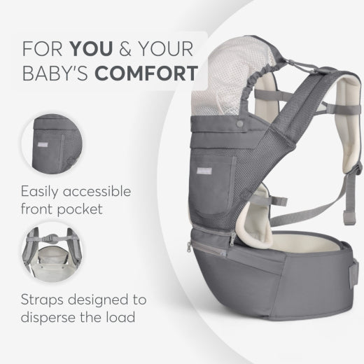 Comfort Designed - Features a wide waist belt and hip seat that evenly distribute baby’s weight, along with adjustable padded shoulder straps for extra support.