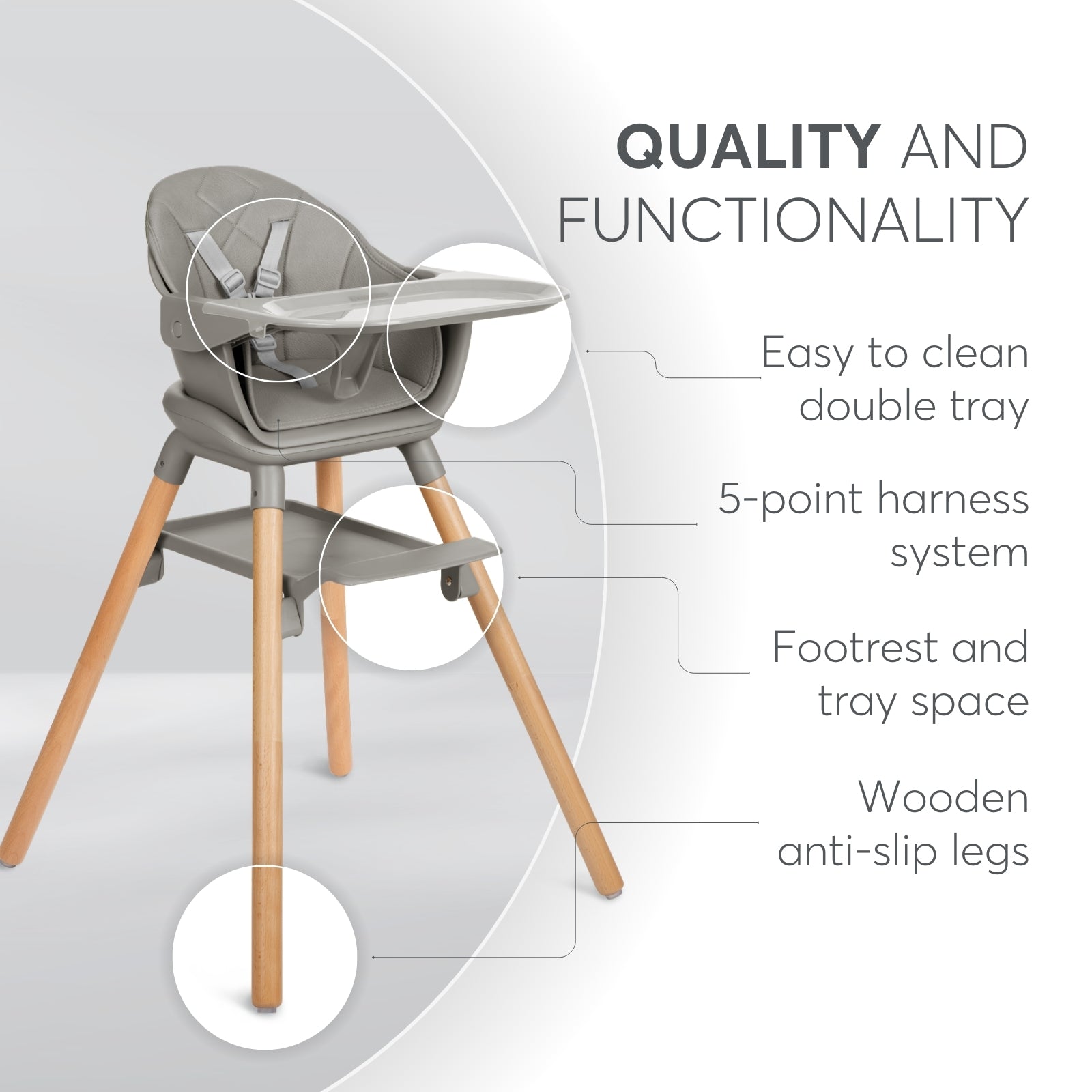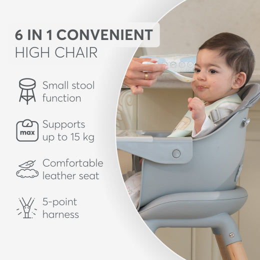 The Woody Highchair 6in1 is a versatile and stylish solution for your child’s mealtime needs. Suitable for children able to sit up unaided up to 3 years (15kg) this multi-functional highchair combines style, practicality, and safety in one elegant design.