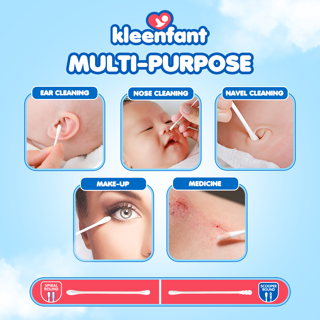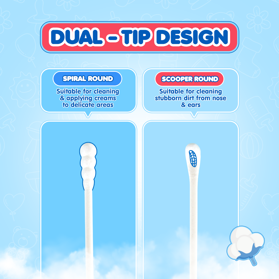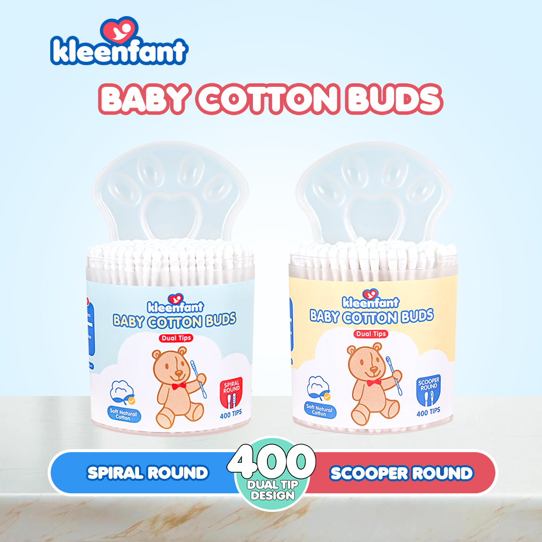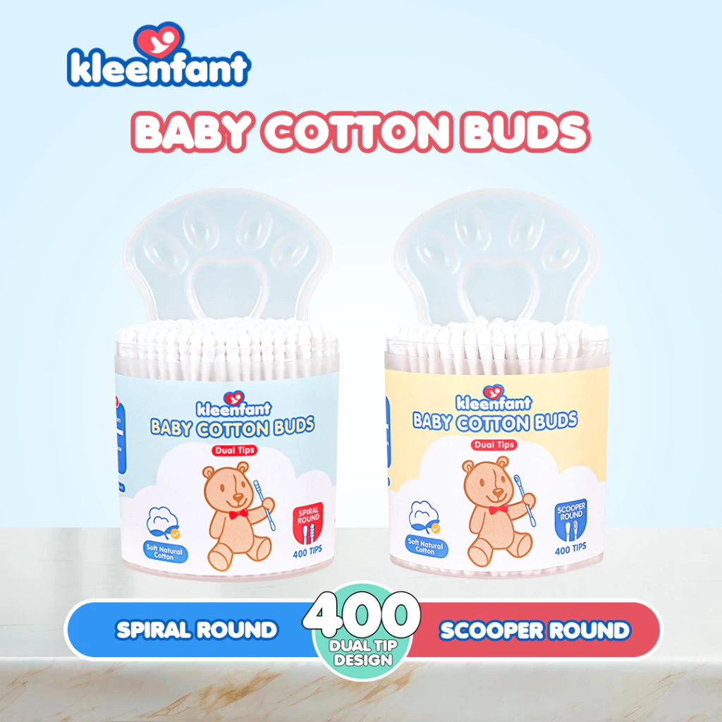 NEW Kleenfant Baby Cotton Buds made out of eco-friendly paper stems and soft natural cotton are designed for durability and precision. Each pack includes 400 usable tips to tackle all your baby’s needs, and features a versatile twin-tip design - you can choose between spiral or scooper variants that are both paired with the traditional round tip - to handle everything from delicate ear cleaning to everyday touch-ups. Trust Kleenfan for a cotton bud that's both strong and sustainable, making every clean-up easy and effective!
