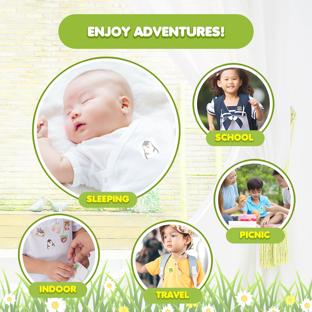 Simply peel the adhesive backing off the patch and stick it onto any of the following surfaces: swaddle, clothes, stroller, crib, or bag.