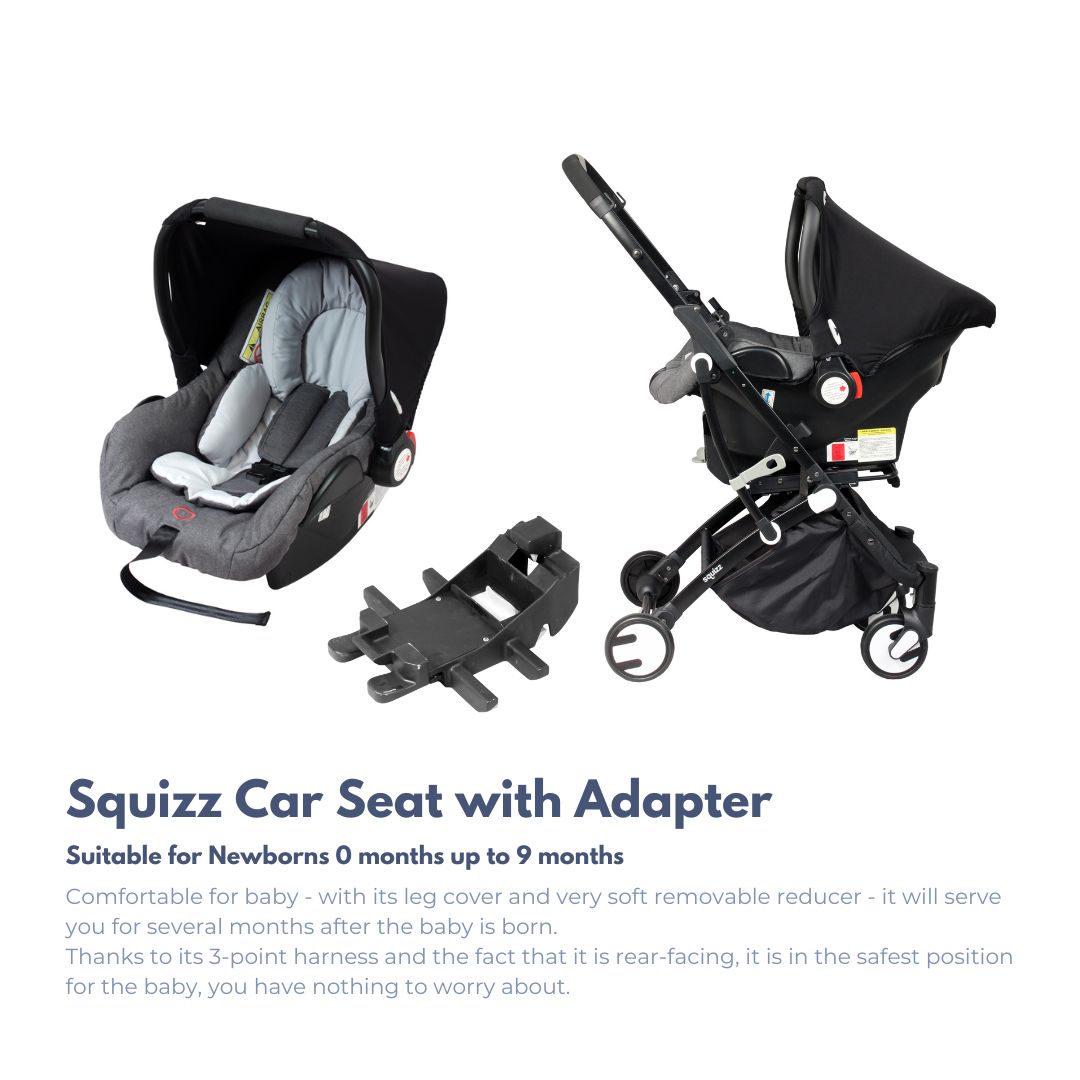 Remove the standard seat of the Squizz stroller and replace with the Squizz Car Seat.