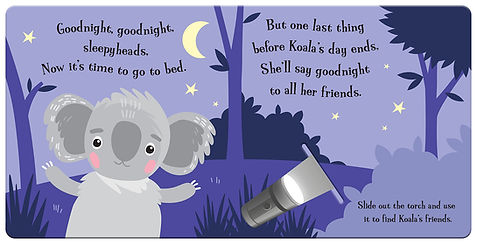 Koala is ready for bed, but first she wants to say goodnight to all her animal friends. Insert the magic torch between the pages to find Koala's friends in each night-time scene and watch children glow with delight!