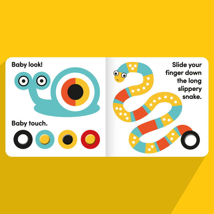 210 x 210mm, board book with 10 pages, including touch-and-feel textures and embossing, a mirror, die-cuts, sliders and a cover wheel