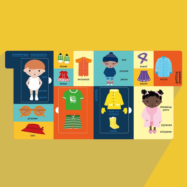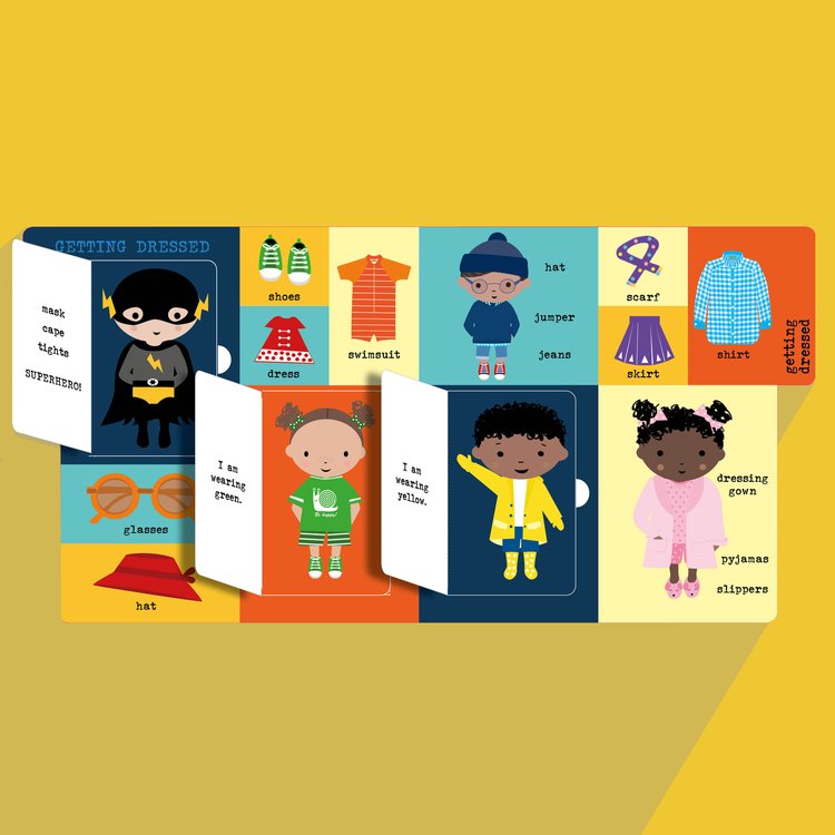BABY’S FIRST 100 WORDS has five themed double-page spreads, each one with flaps to lift and a tab for easy page-turning. The themes are around the home, getting dressed, vehicles, animals and mealtime. The images are bright, colourful and inclusive, and the flaps are integrated (not stuck on), designed to be strong enough to withstand enthusiastic handling.