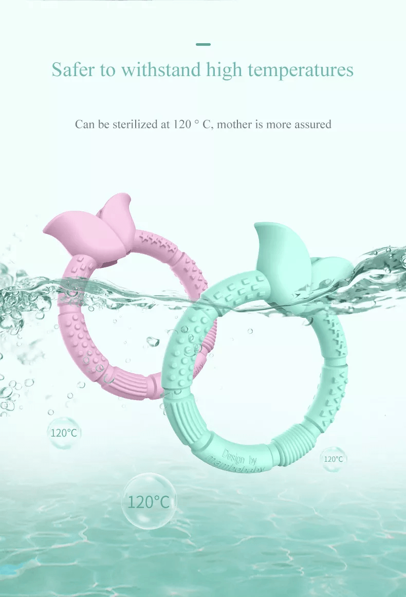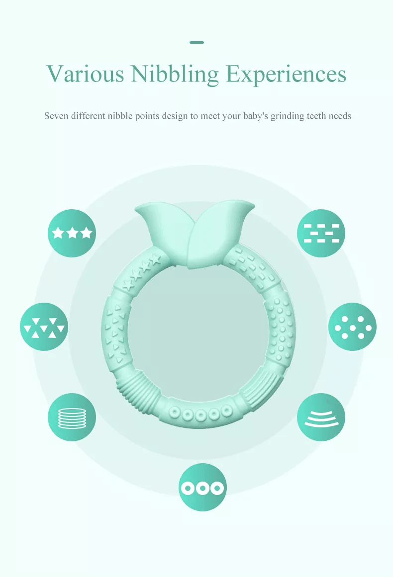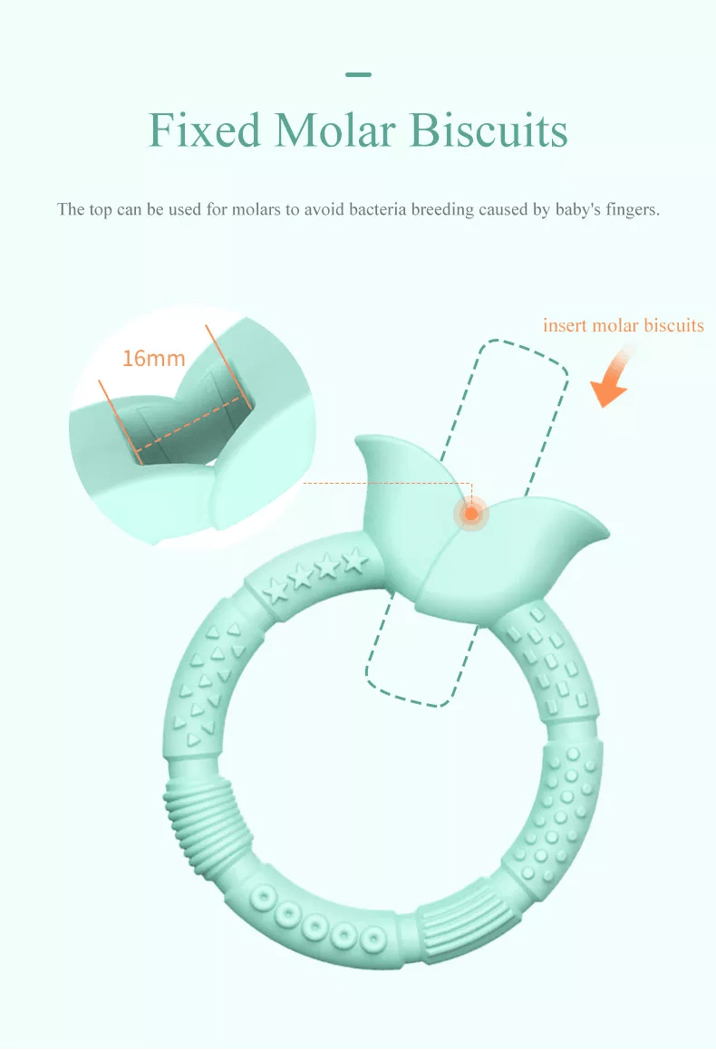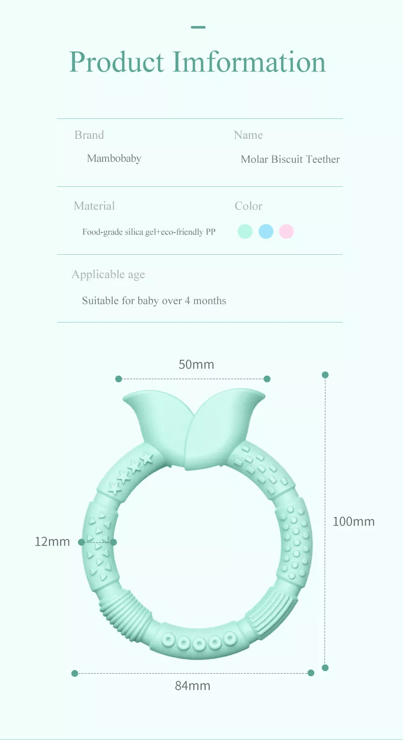 The NewOne's biscuit teether is highly elastic, soft, and flexible that protects baby's immature gums. For baby's small hands, there is ergonomic design that is easy to grasp and exercises baby's grip ability. It has seven different nibble points design to meet baby's grinding teeth needs and for various nibbling experiences.