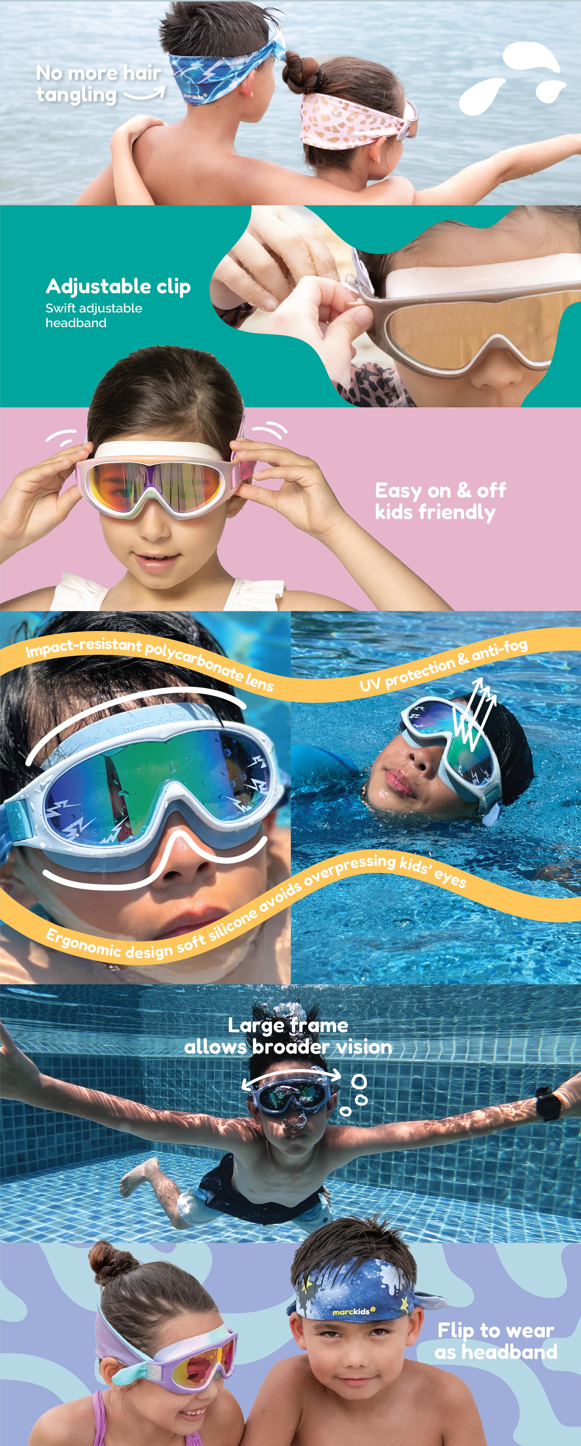 The Award-Winning Swim Goggles with Headband is the ultimate swim accessory for young swimmers. These swim goggles with fabric strap ensure a secure and comfortable fit, making them the best large frame swim goggles on the market. The swim goggles with elastic cloth strap is reversible that offers a fashionable twist, allowing kids to switch up their look with ease, while the anti-fog technology guarantees clear vision underwater. Designed with UV protection, these swim goggles shield delicate eyes from harmful rays, making them perfect for outdoor swimming. Made with soft silicone, avoid any leaking problem, the goggles provide a comfortable fit without any pressure on young eyes. Additionally, the patent-pending lock on both sides allows kids to easily adjust the tightness of the fabric strap, ensuring a secure fit. Specifically designed for junior swimmers, these goggles blend comfort, style, and performance seamlessly.