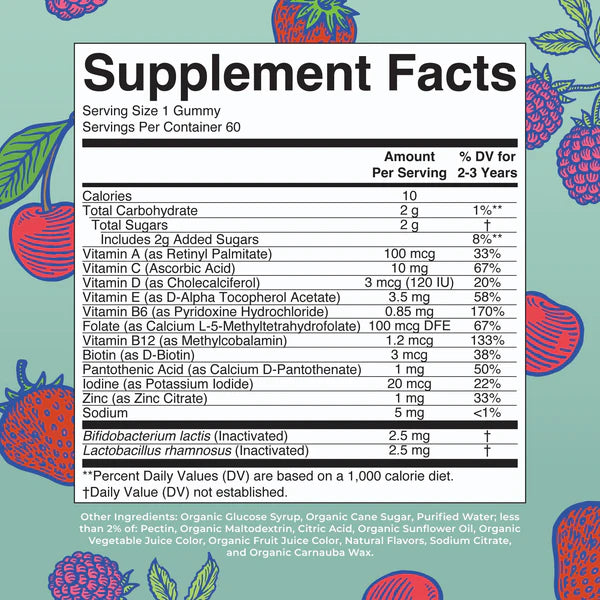 Support Your Growing Toddler’s Health With Multiple Essential Nutrients & a Postbiotic! Give your child just one vegan gummy daily for 10 essential vitamins and minerals plus a postbiotic.