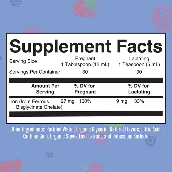 Promotes Overall Health & Wellness for Mom While Supporting Cognitive Development for Baby. This essential mineral, needed in greater quantities during pregnancy, comes in an easy-to-take liquid form to support your iron intake, all in a delicious berry flavor.