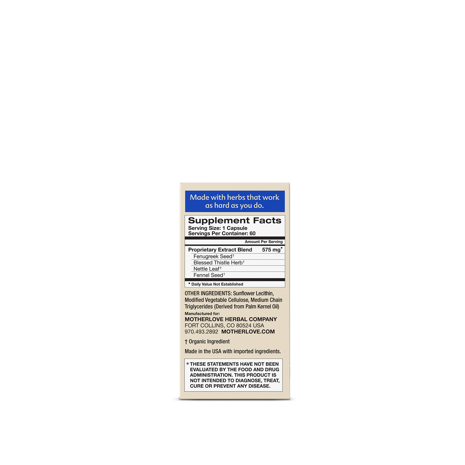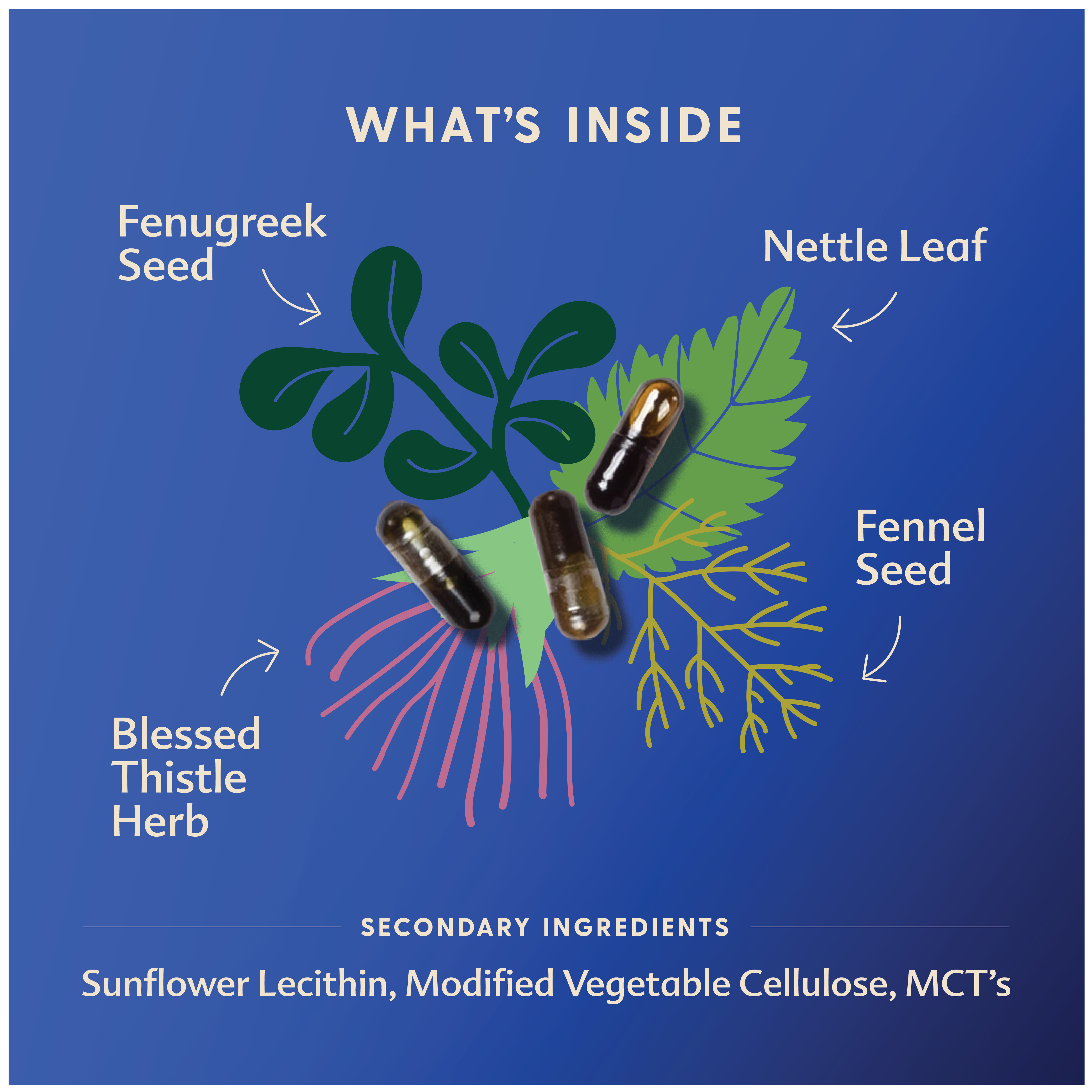 Fenugreek seed*, blessed thistle herb*, nettle leaf*, fennel seed*, sunflower lecithin, modified vegetable cellulose, medium-chain triglycerides (derived from palm kernel oil). Note: *organic ingredients