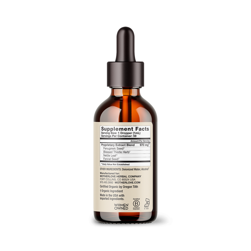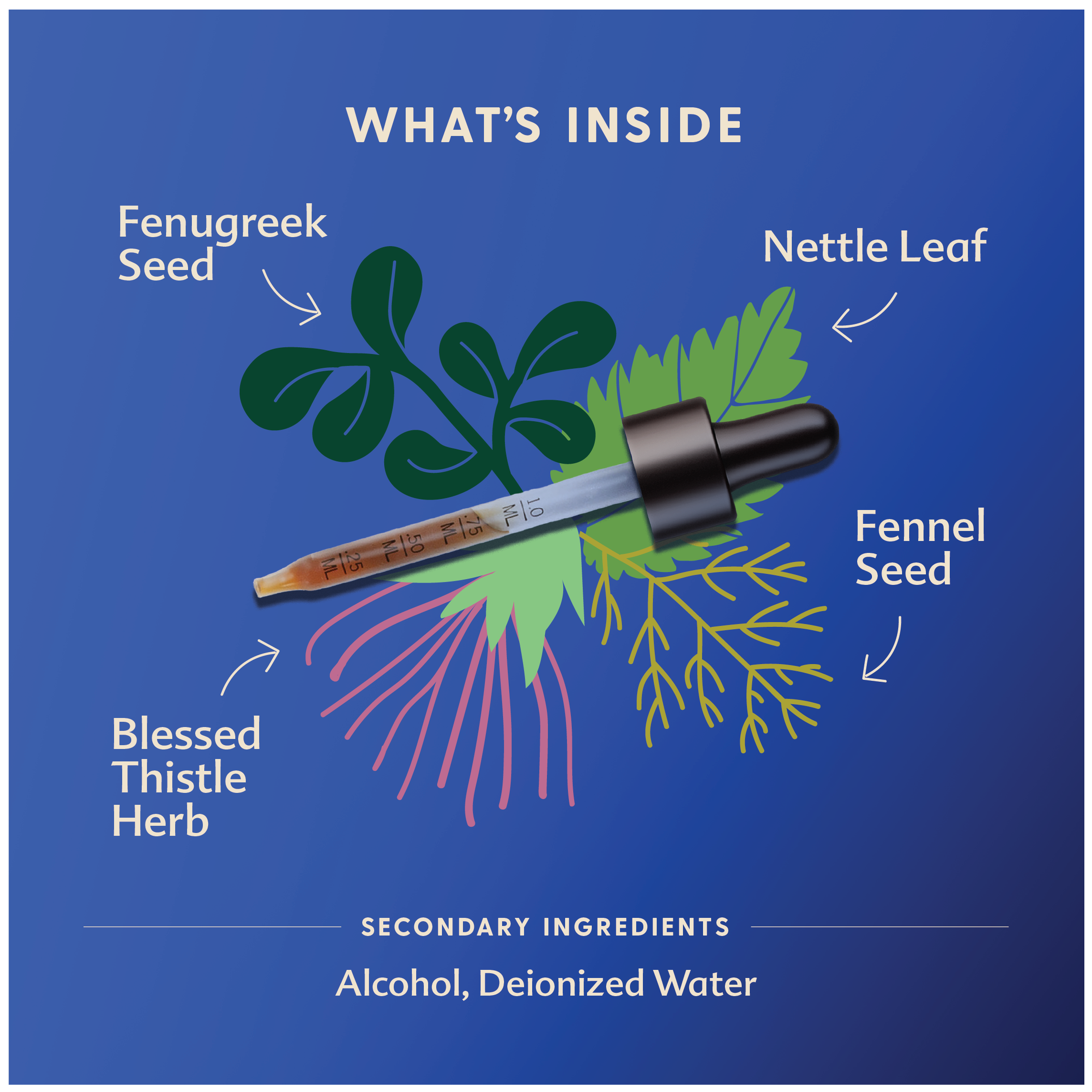 Ingredients: Fenugreek seed*, blessed thistle herb*, nettle leaf*, fennel seed*, alcohol*, deionized water. *organic ingredients