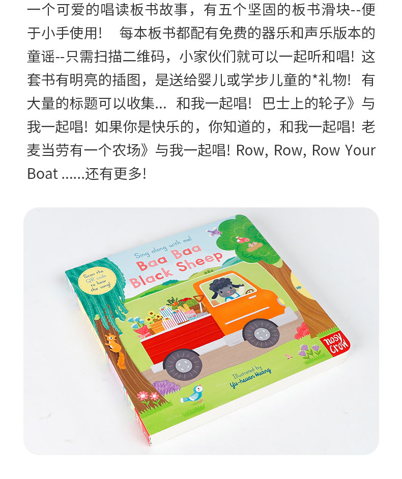Each board book comes with a free instrumental and vocal version of the nursery rhyme – simply scan the QR code for little ones to listen and sing along!