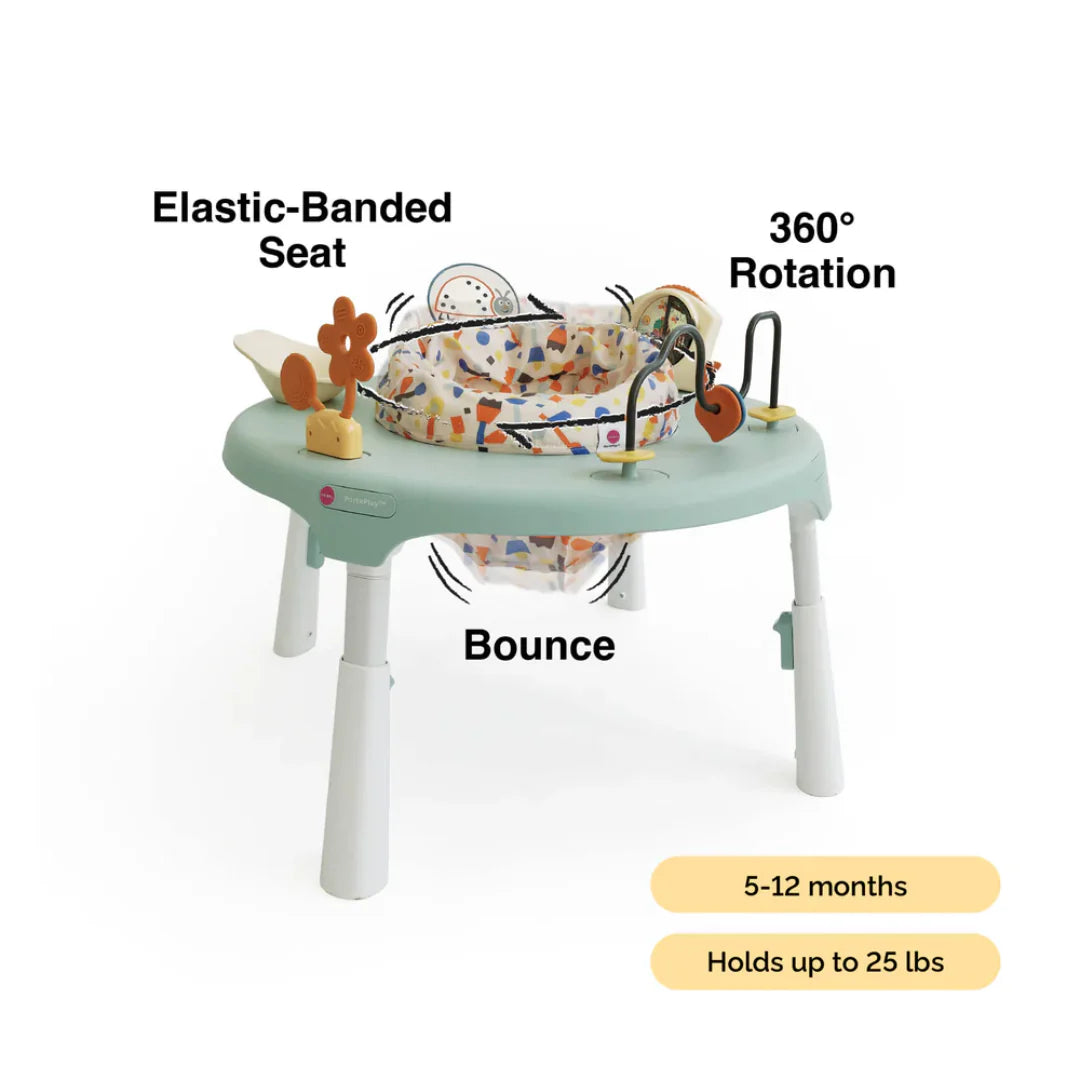 The seat spins 360 degrees too, encouraging baby to reach out for toys all around, developing their gross motor skills.