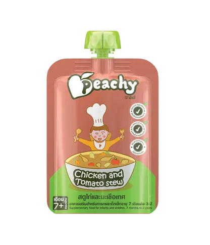 Homemade style chicken and tomato stew made with S-Pure chicken from Betagro. There are strong flavors from the tomato and onion combination making this product an ideal way to start expanding the baby’s sense of exciting new flavors.