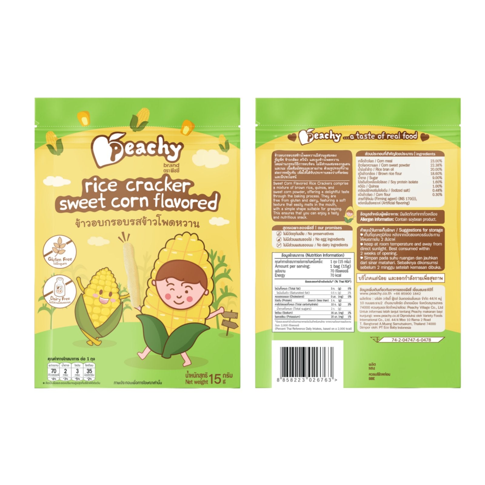 Sweet Corn Flavored Rice Crackers comprise a mixture of brown rice, quinoa, and sweet corn powder, offering a delightful taste through the baking process. They are free from gluten and dairy, featuring a soft texture that easily melts in the mouth, with a simple shape suitable for grasping. This ensures that you can enjoy a tasty and nutritious snack.