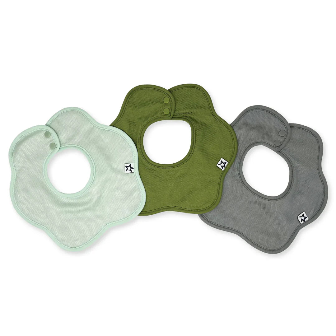 This set features three soft, absorbent and water repellant, roundabout bibs. Versatile, roundabout design allows the bib to work for multiple feedings, simply rotate the bib to find a new clean spot once it gets messy!