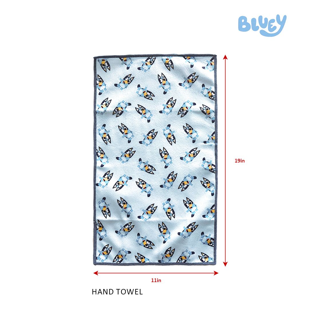 Keep clean in Bluey style! This towel set features a Bluey character face towel and a matching hand towel with an all-over Bluey print—perfect for school bags or bathroom use.