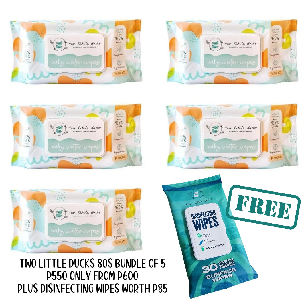 Save Php50 and get a free pack of Two Little Ducks Surface Wipes for every purchase of Baby Water Wipes bundle of 5!