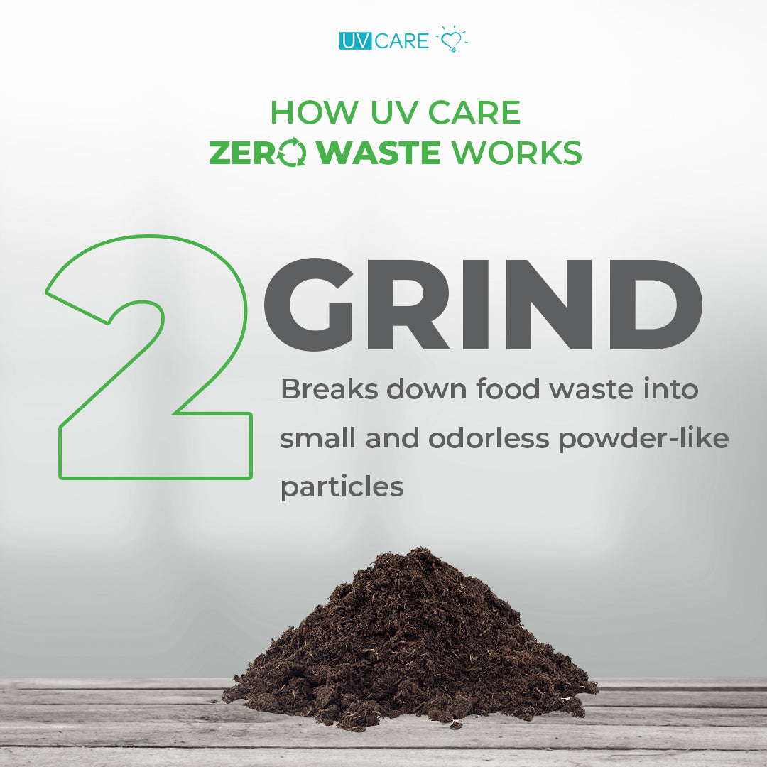 Grind. Once the food waste has been reduced in size, the process further breaks down food waste into small, powder-like particles which can be easily mixed in with soil to release nutrients upon immediate application of the by-product.